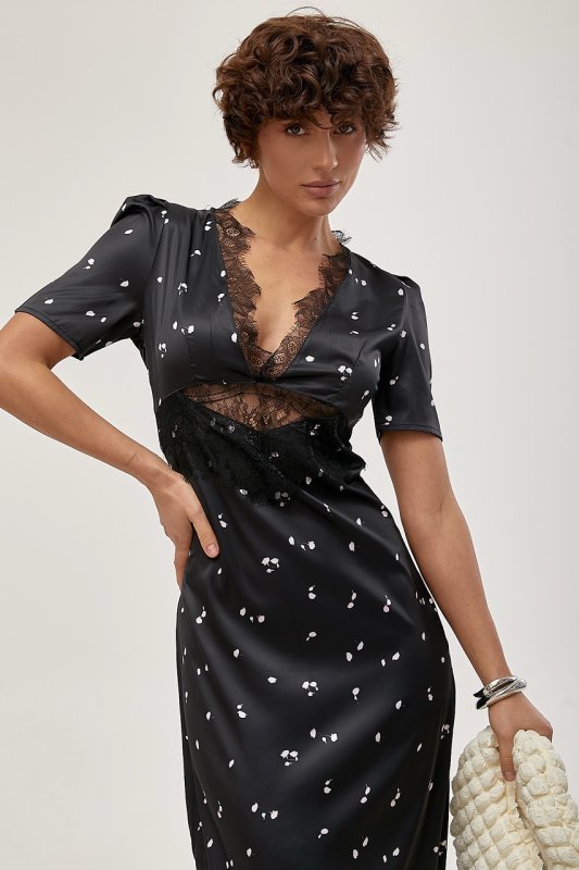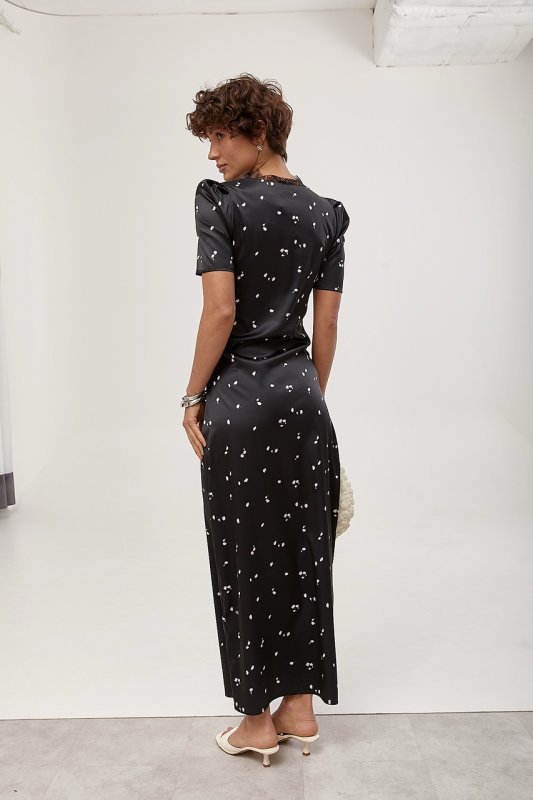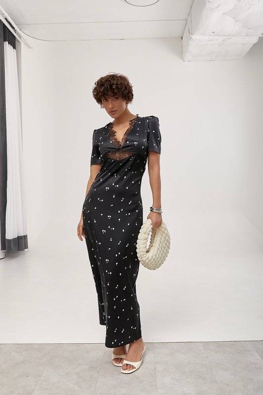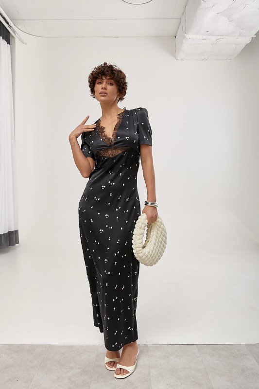 Атласна довга сукня з мереживом 30130 чорний