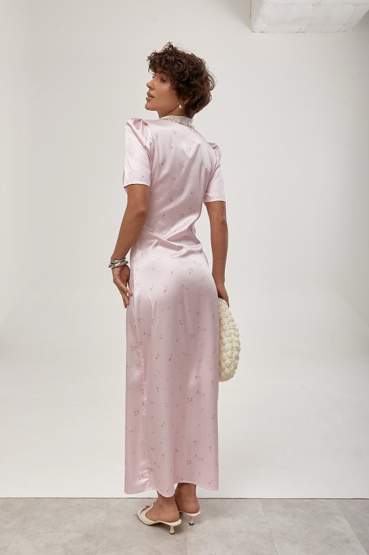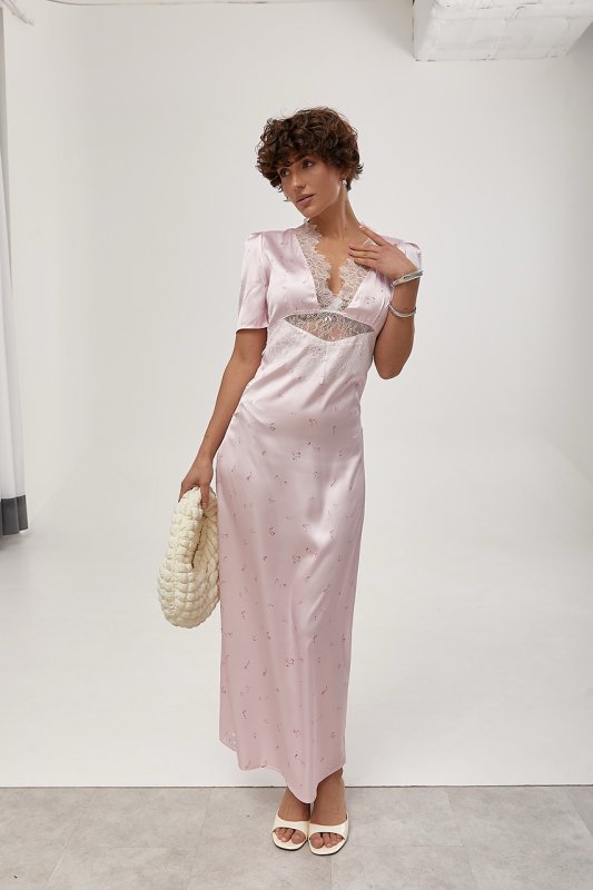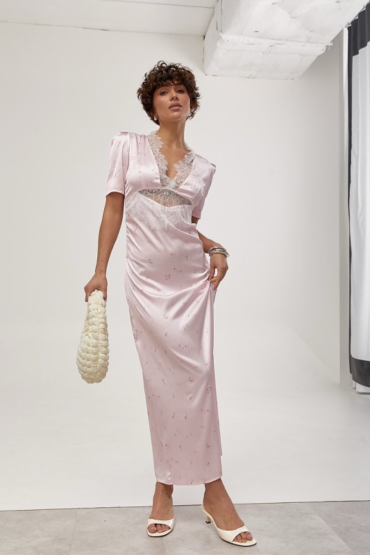 Атласна довга сукня з мереживом 30130 рожевий
