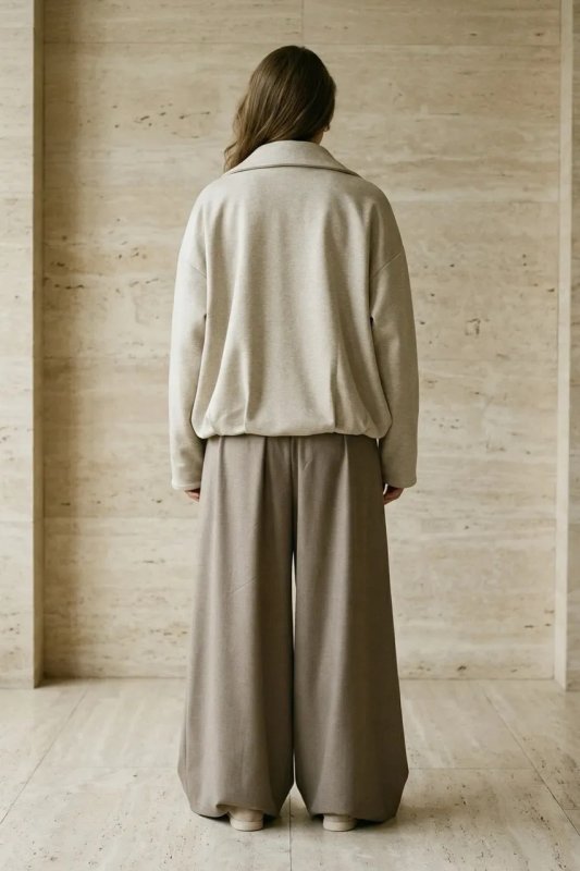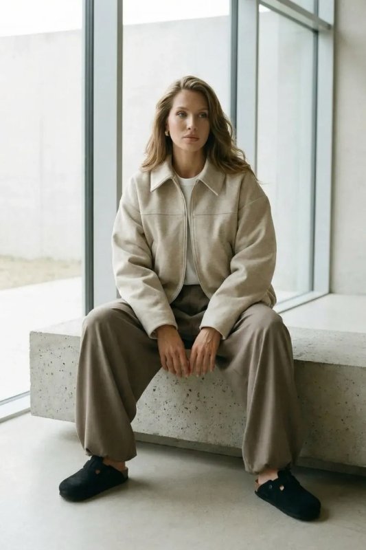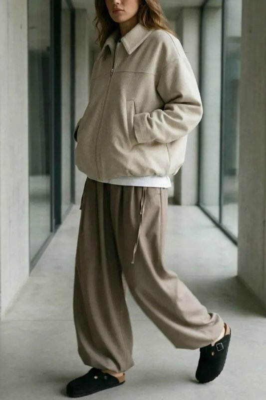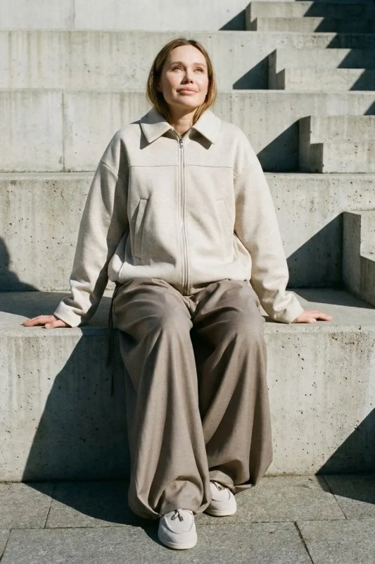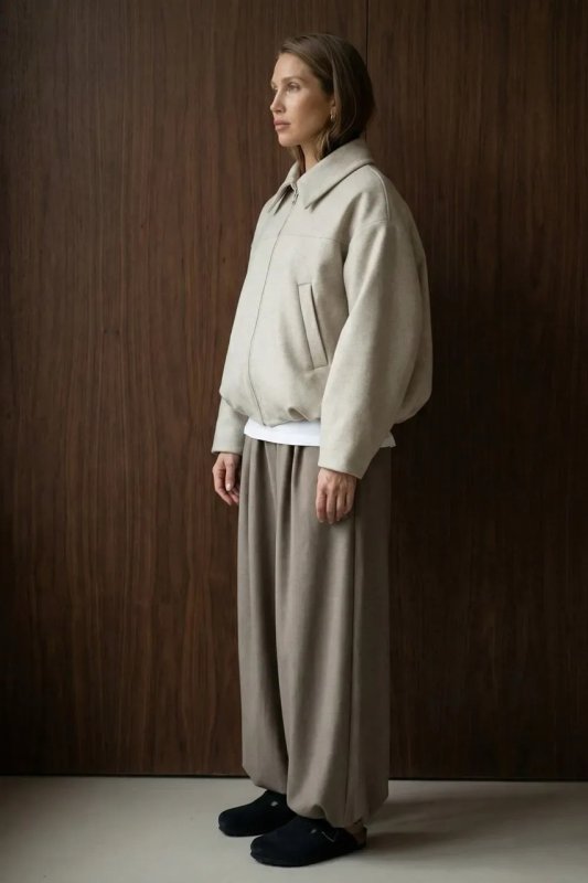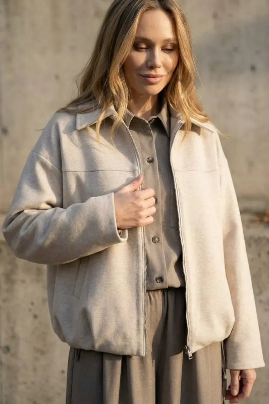 Стильний демісезонний бомбер з італійської вовни в бежевому кольорі — комфортна та універсальна річ для повсякденного гардероба. Вільний фасон і спущений рукав забезпечують зручну посадку, а декоративні защипи по низу додають модний акцент. Модель застібається на блискавку та оснащена зручними кишенями.