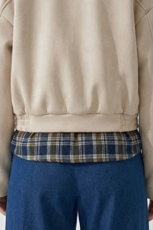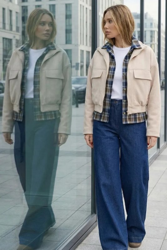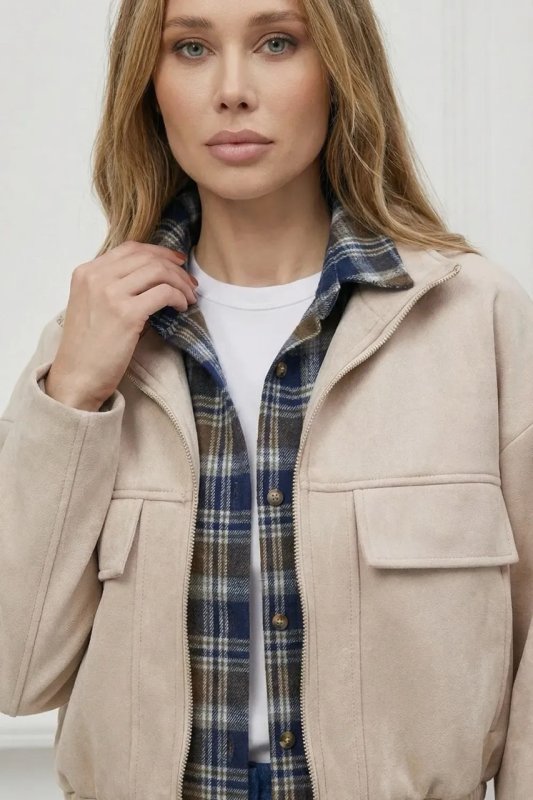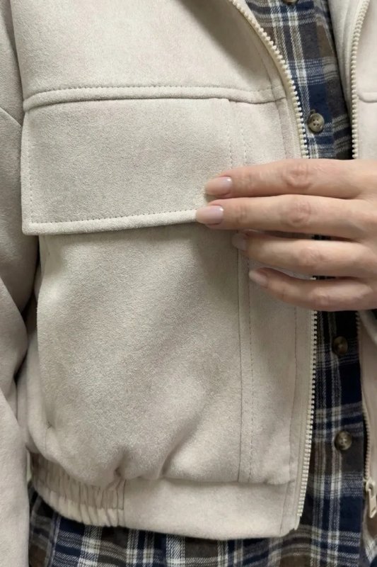 Стильний демісезонний бомбер зі світлого замшу вільного прямого крою. Модель оснащена коміром-стійкою, боковими кишенями та накладними клапанами, а приспущений рукав додає сучасного силуету. Застібка на блискавку та резинка забезпечують комфорт і зручність у носінні.