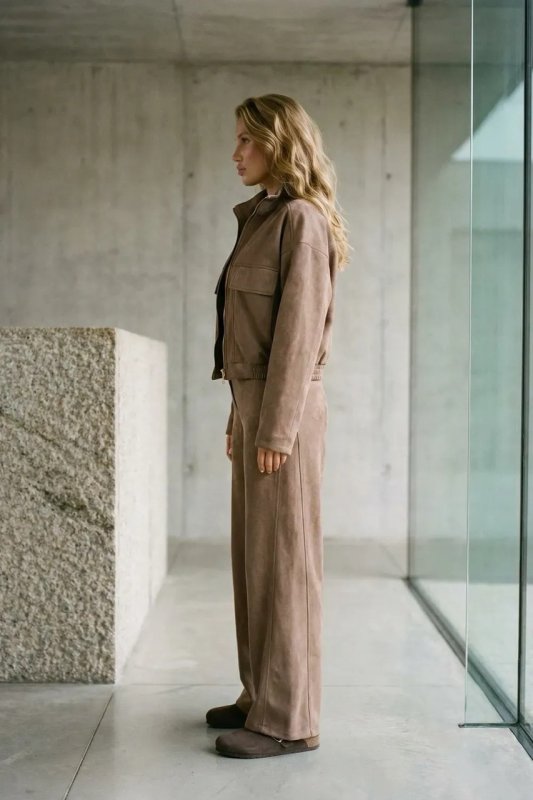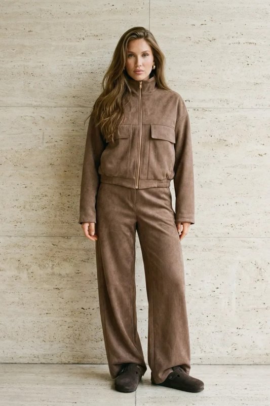 Стильний демісезонний бомбер з коричневої замші з накладними клапанами та спущеним рукавом.