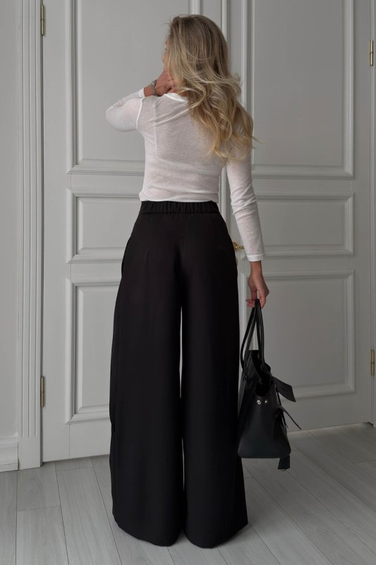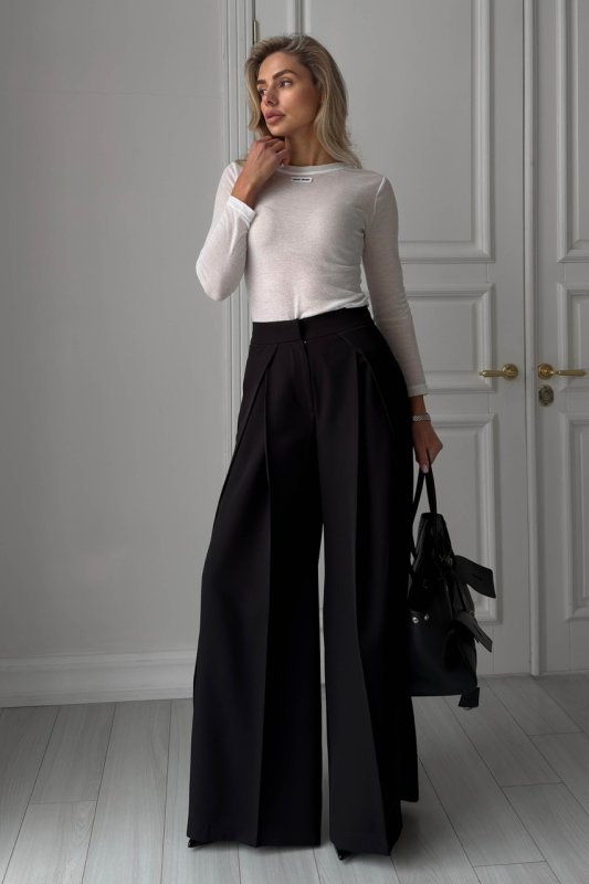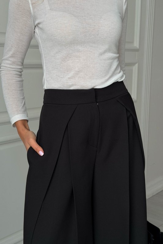 Модель із високою посадкою акцентує талію та красиво спадає від стегна, формуючи витягнутий, елегантний силует. Завдяки костюмній тканині брюки добре тримають форму та виглядають охайно протягом усього дня. Складки додають об’єму в зоні стегон і роблять посадку більш витонченою, а універсальний крій дозволяє легко стилізувати модель як у ділових, так і в повсякденних образах.