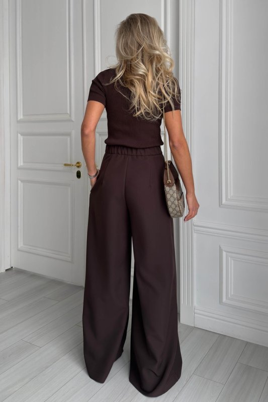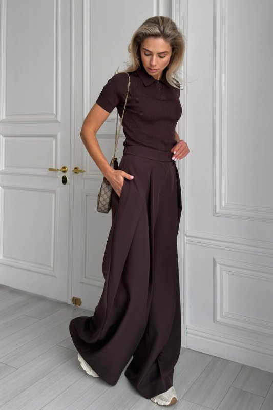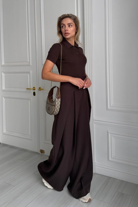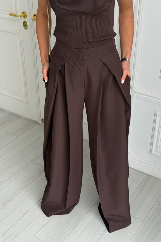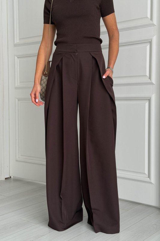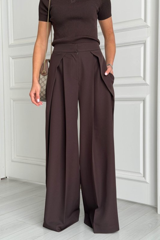 Модель із високою посадкою акцентує талію та красиво спадає від стегна, формуючи витягнутий, елегантний силует. Завдяки костюмній тканині брюки добре тримають форму та виглядають охайно протягом усього дня. Складки додають об’єму в зоні стегон і роблять посадку більш витонченою, а універсальний крій дозволяє легко стилізувати модель як у ділових, так і в повсякденних образах.