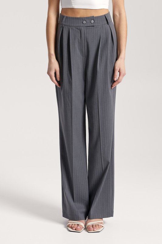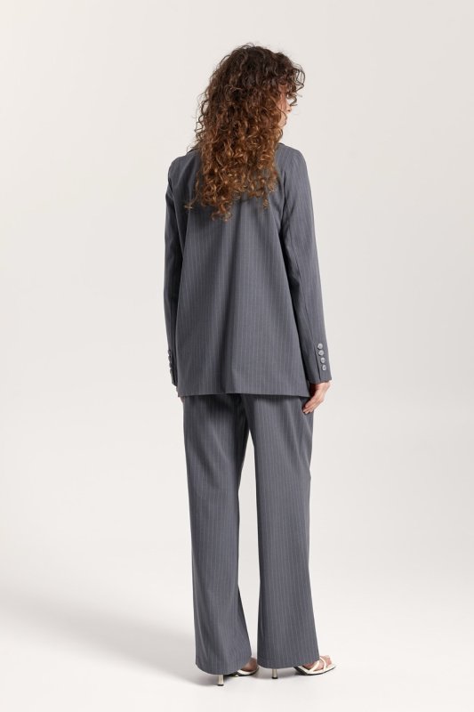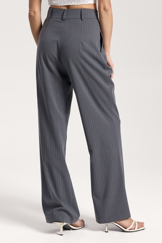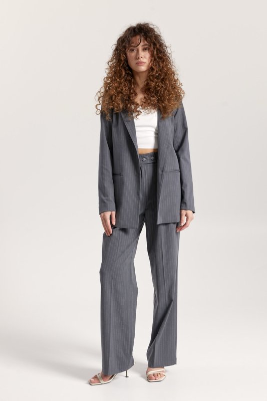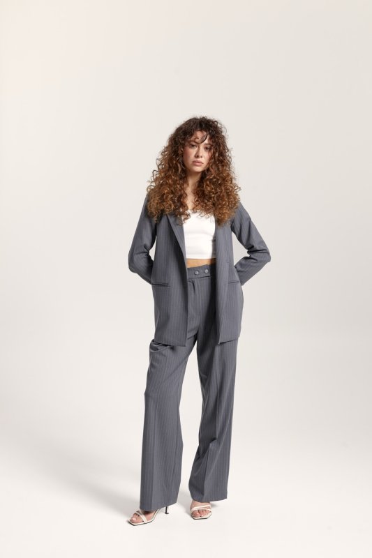 Штани: прямого крою, на талії шльовки для знімного поясу. Застібка: ґудзик і прихована блискавка. Передні половинки зі стрілками та складками. Кишені розташовані в бічних швах. Задні половинки з виточками.