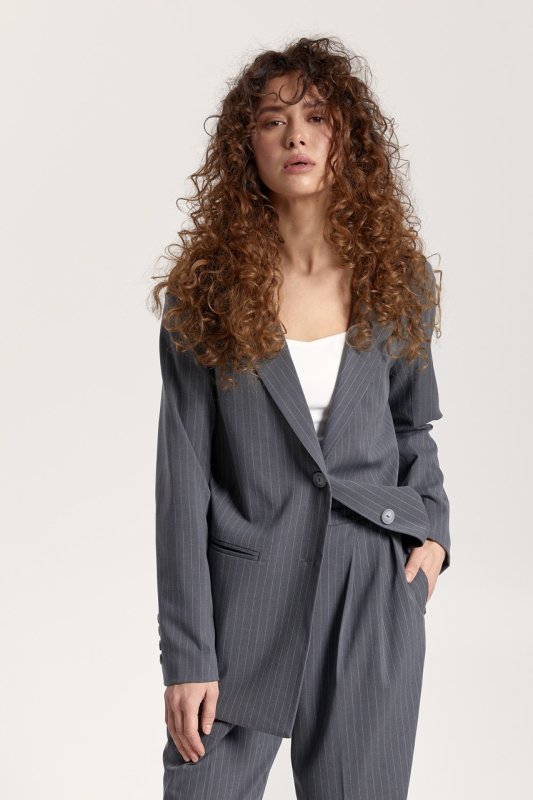 Піджак: двобортний, на підкладці, довжина нижче лінії стегон. Рукави вшиті, довгі, двошовні з ґудзиками на імітованій шліці. Кишені прорізні з обшивками. Комір піджачного типу, застібається на ґудзики, низ борту округлений.