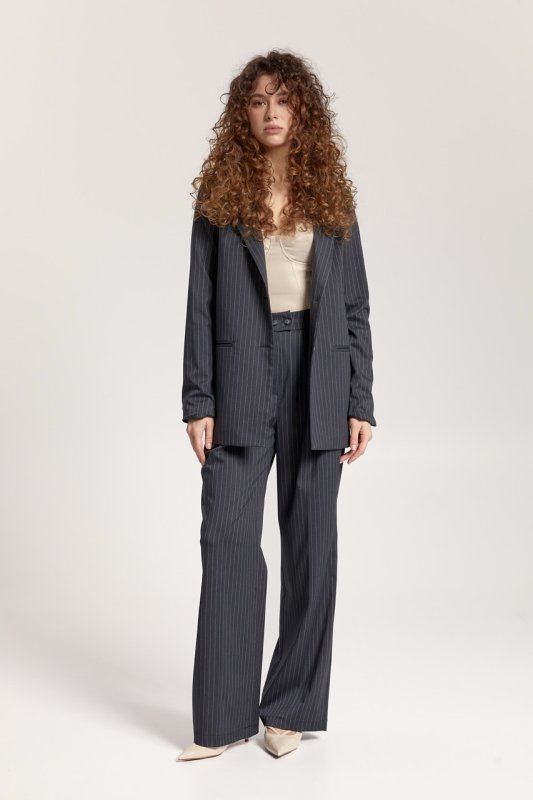 Штани: прямого крою, на талії шльовки для знімного поясу. Застібка: ґудзик і прихована блискавка. Передні половинки зі стрілками та складками. Кишені розташовані в бічних швах. Задні половинки з виточками.