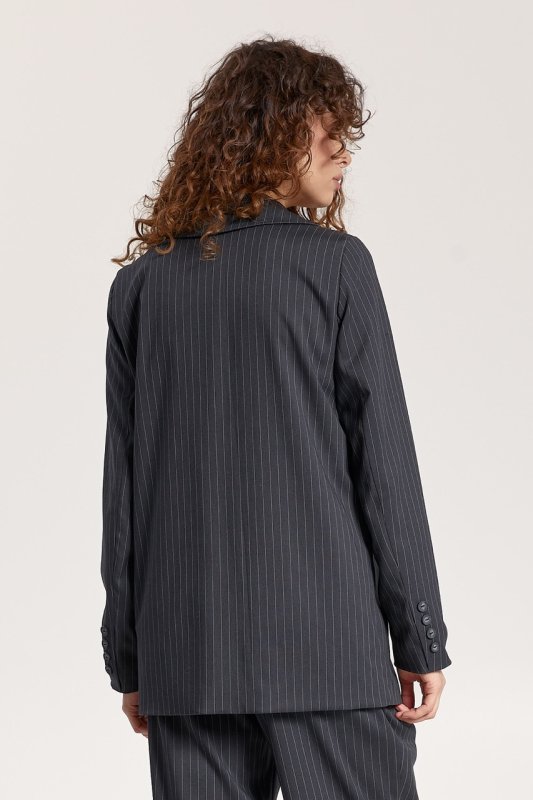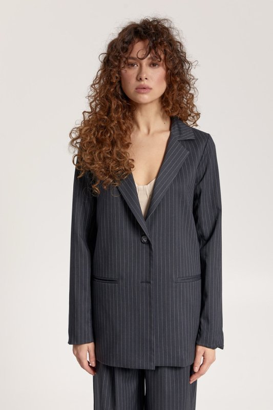 Піджак: двобортний, на підкладці, довжина нижче лінії стегон. Рукави вшиті, довгі, двошовні з ґудзиками на імітованій шліці. Кишені прорізні з обшивками. Комір піджачного типу, застібається на ґудзики, низ борту округлений.