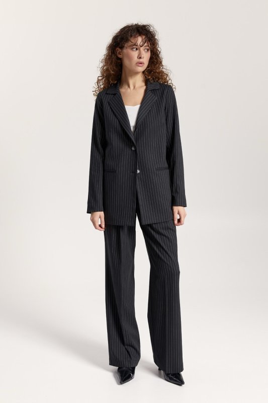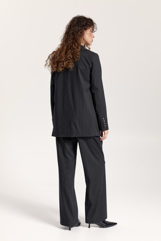 Штани: прямого крою, на талії шльовки для знімного поясу. Застібка: ґудзик і прихована блискавка. Передні половинки зі стрілками та складками. Кишені розташовані в бічних швах. Задні половинки з виточками.