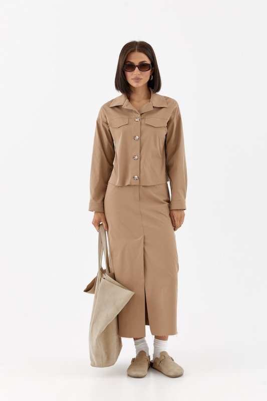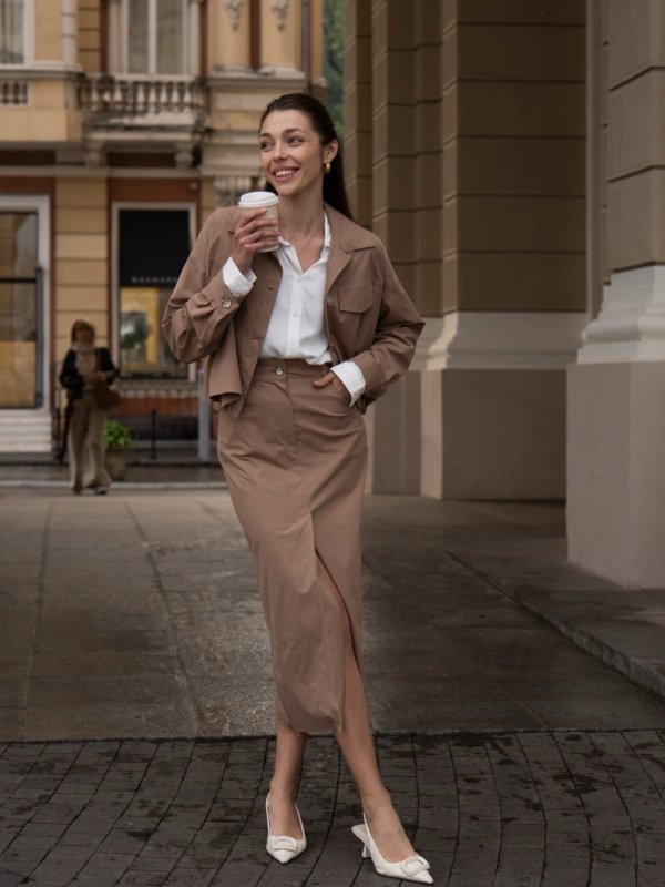 Спідниця: пряма, міді, з центральним розрізом спереду. Нижній край спідниці також необроблений, що гармонує з верхом.