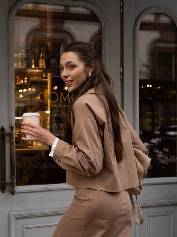 Піджак: прямого крою з довгими рукавами. Має відкладний комір, накладні кишені на грудях та застібку на ґудзики спереду. Край виробу необроблений, трохи «рваний», що надає образу невимушеності.