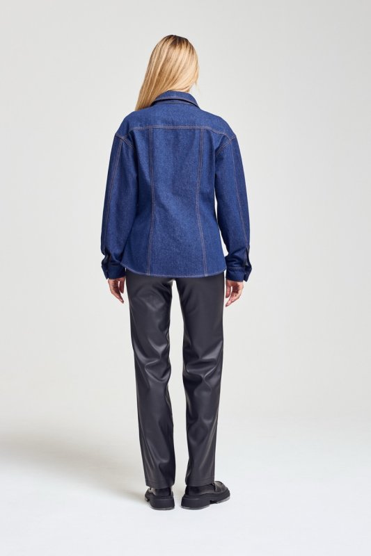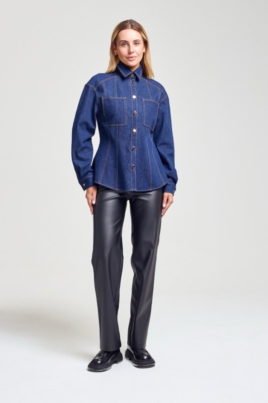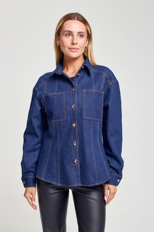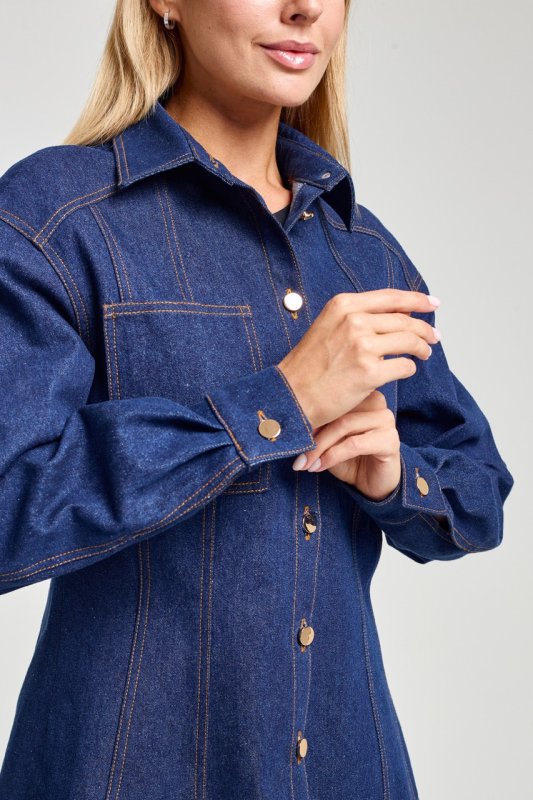 Джинсова куртка приталеного силуету з легким розширенням по лінії стегон створює жіночний та елегантний образ. Модель прикрашена золотистими ґудзиками, що додають вишуканого акценту. Завдяки універсальному крою куртку можна носити поверх футболки, джемпера чи інших базових речей. Стильний дизайн робить її доречною як у повсякденних, так і більш вишуканих поєднаннях.
