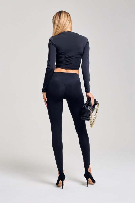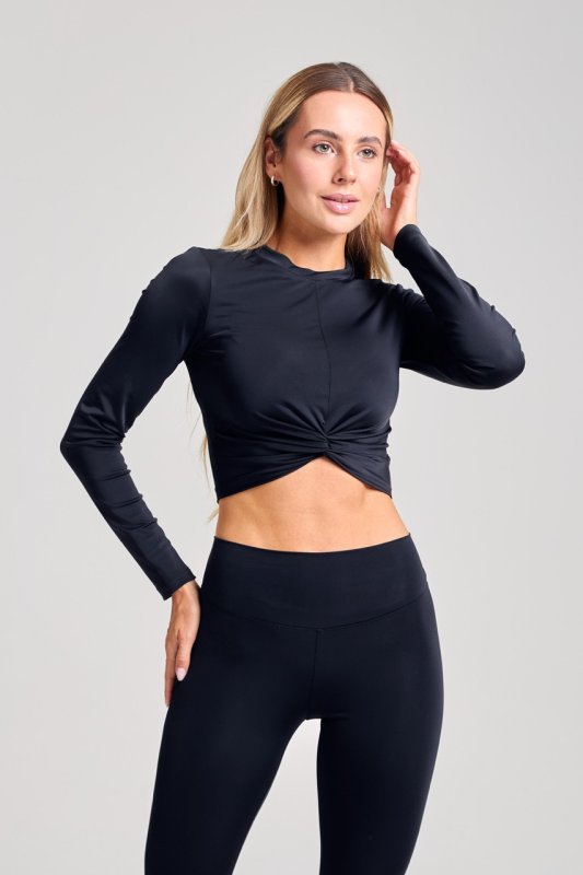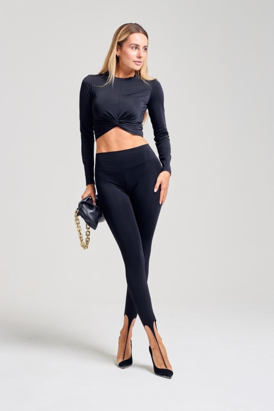 Лонгслів виконаний із еластичного трикотажу біфлекс, що забезпечує комфорт та ідеальну посадку по фігурі. Попереду має імітацію вузла, яка створює цікавий акцент у дизайні. Модель укорочена, поєднує нарядність і повсякденну практичність, легко компонується з різними низами.