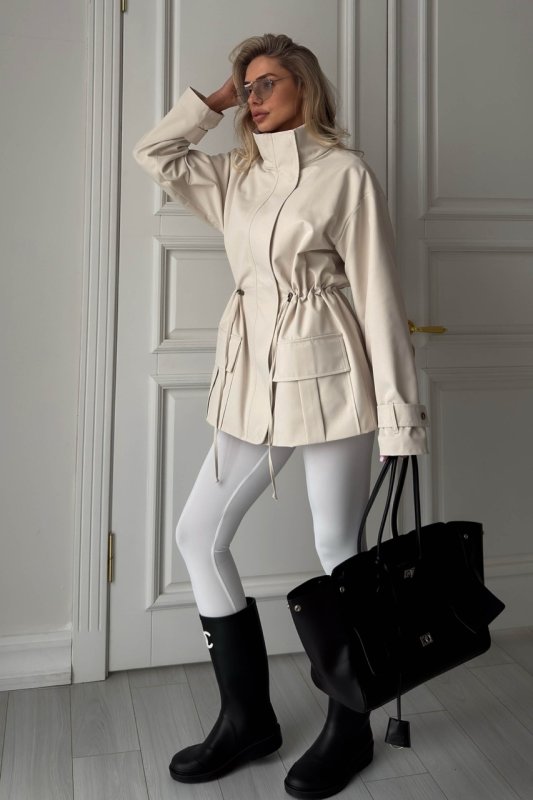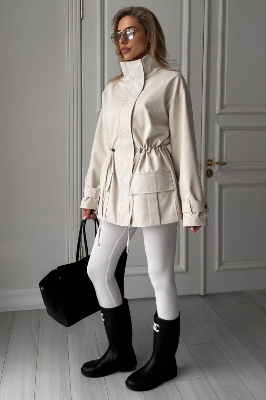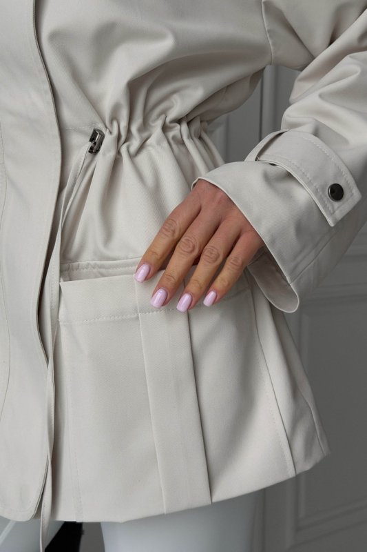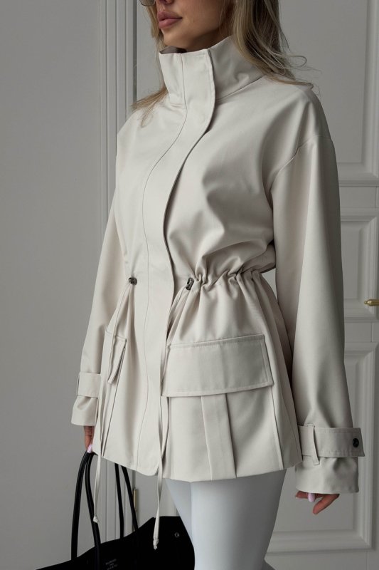 Парка з щільної плащової тканини — стильна модель у вільному силуеті з акцентом на фактуру. Водонепроникна тканина з жакардовою підкладкою добре тримає форму, а куліска по талії дозволяє змінювати посадку та підкреслювати силует. Накладні кишені, комір-стійка та поєднання блискавки з кнопками додають практичності й сучасного характеру.