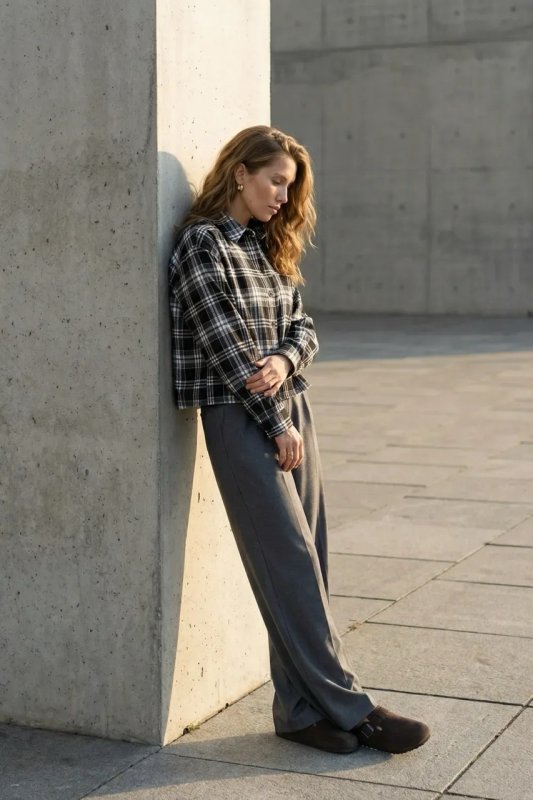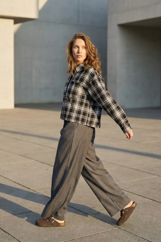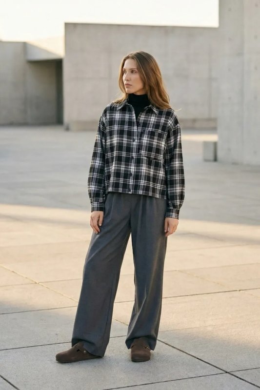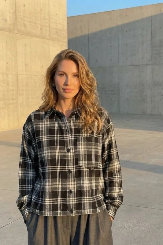 Стильна демісезонна сорочка з сорочкового кашеміру в клітинку — прямий вільний фасон для комфортного повсякденного образу. Модель оснащена цільнокроєною планкою та класичним сорочковим коміром, а декоративні елементи, такі як затяжка по низу та накладна кишеня, додають сучасний акцент. Фурнітура включає ґудзики, резинку та затискачі для регулювання посадки.