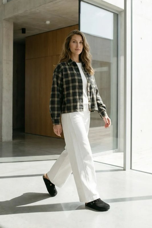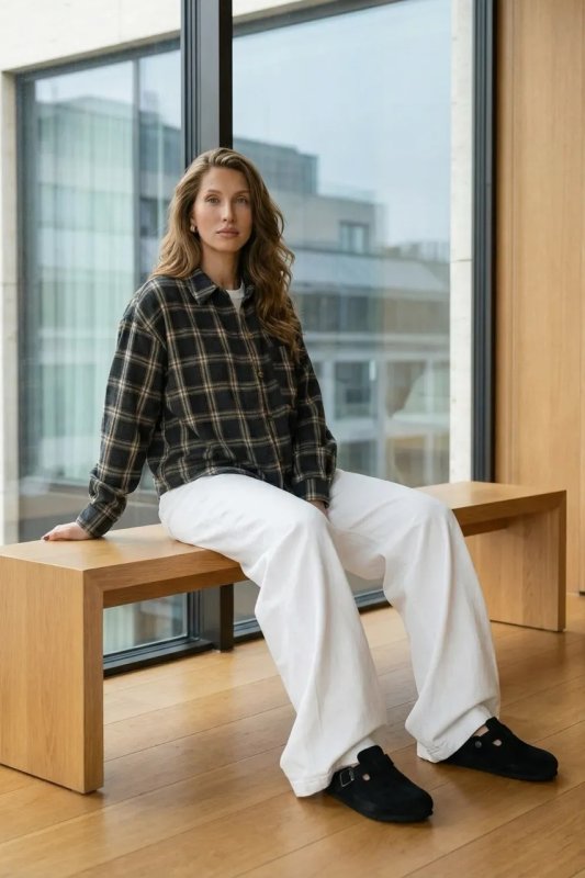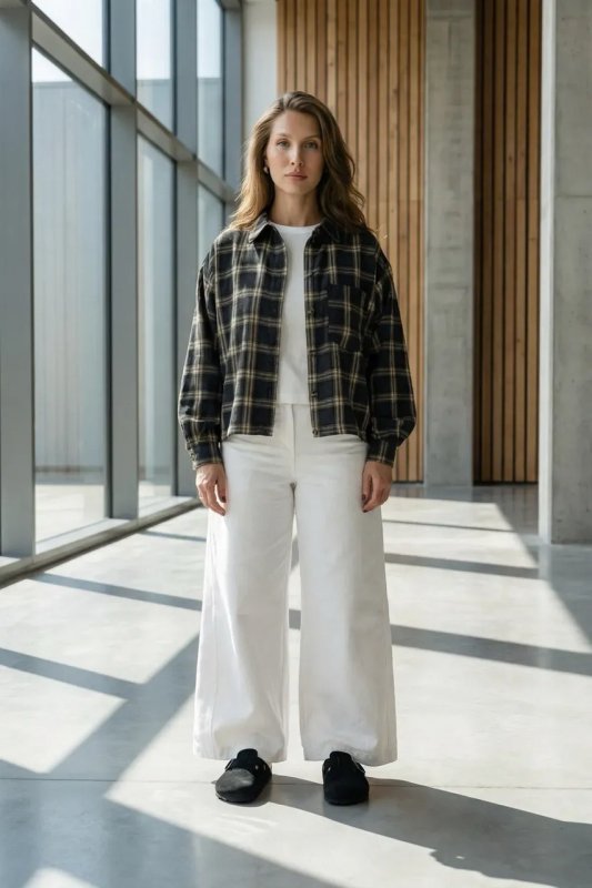 Стильна демісезонна сорочка з сорочкового кашеміру в клітинку — прямий вільний фасон для комфортного повсякденного образу. Модель оснащена цільнокроєною планкою та класичним сорочковим коміром, а декоративні елементи, такі як затяжка по низу та накладна кишеня, додають сучасний акцент. Фурнітура включає ґудзики, резинку та затискачі для регулювання посадки.