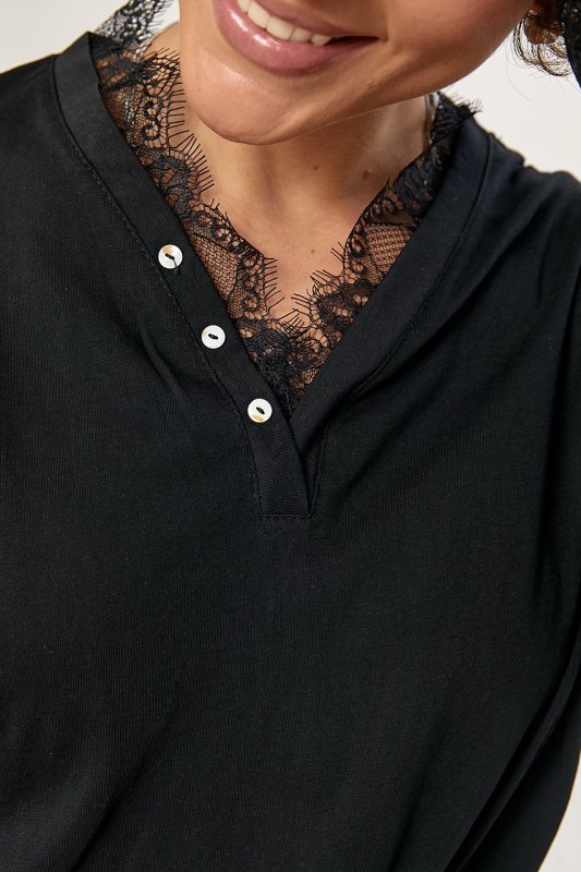 V-подібний виріз витончено підкреслює лінію шиї та додає образу легкості. Мереживні вставки на горловині та рукавах створюють делікатний акцент, роблячи дизайн більш виразним і романтичним. Прямий низ виглядає акуратно й універсально.