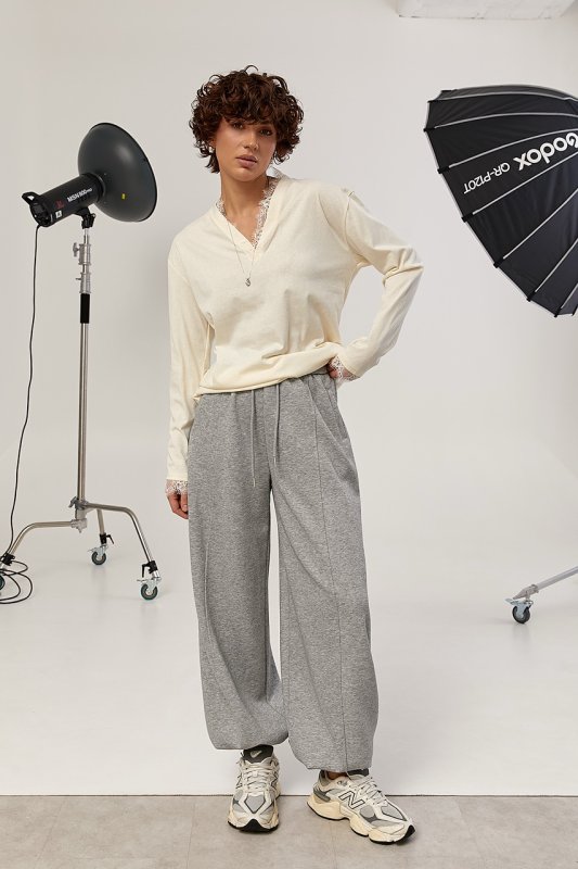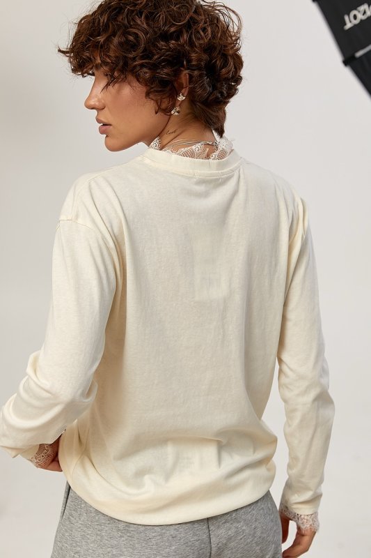 Вільний лонгслів із мереживом — поєднання комфорту та ніжної жіночності. Модель виконана з однотонного трикотажу, приємного до тіла та зручного для щоденного носіння. Вільний фасон створює розслаблений силует і добре пасує до різних типів фігури.