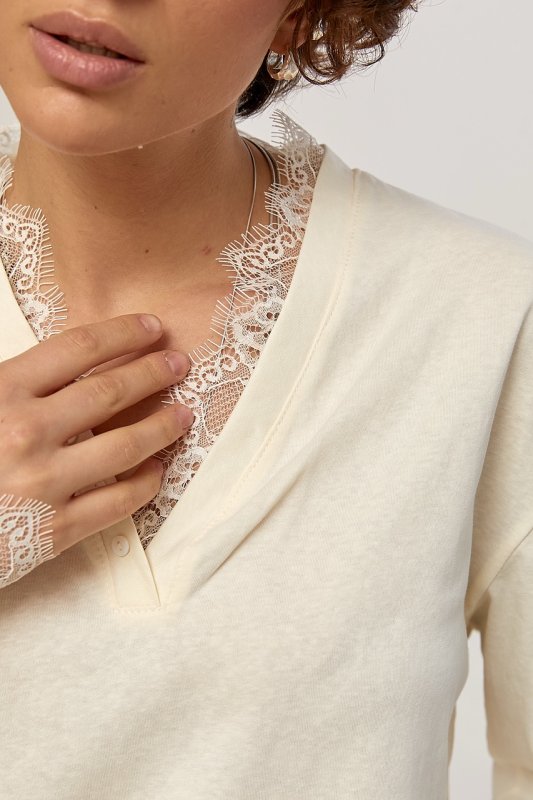 V-подібний виріз витончено підкреслює лінію шиї та додає образу легкості. Мереживні вставки на горловині та рукавах створюють делікатний акцент, роблячи дизайн більш виразним і романтичним. Прямий низ виглядає акуратно й універсально.