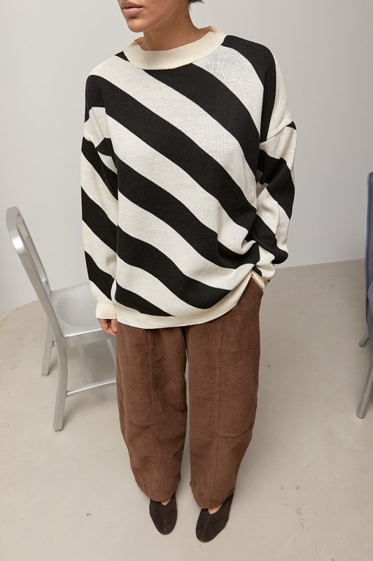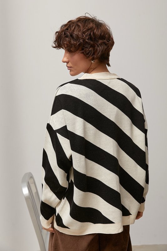 Трикотажна в’язана кофта у діагональну смужку — стильна модель із цікавим фактурним акцентом. Візерунок у діагональ візуально динамізує силует і додає виробу сучасного характеру.
