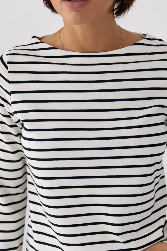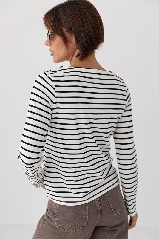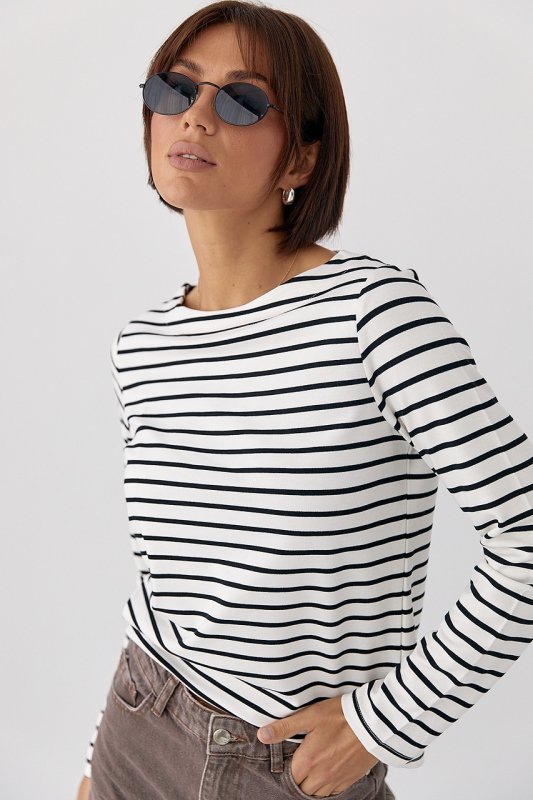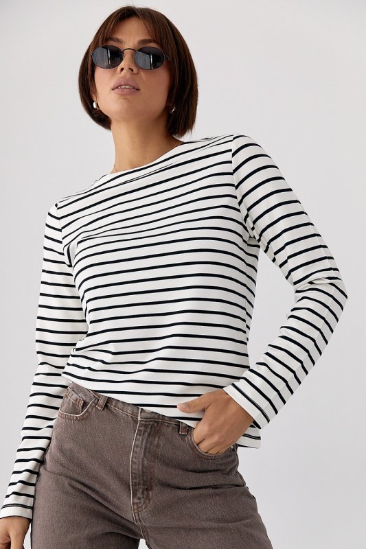 Модель має напівприталений, але водночас прямий крій, що підкреслює силует і не сковує рухів. Класична кругла горловина та прямий низ додають лонгу лаконічності, а широкі довгі рукави створюють легкий акцент на сучасний oversize-ефект. Контрастні смуги надають виробу динаміки та роблять образ виразнішим.