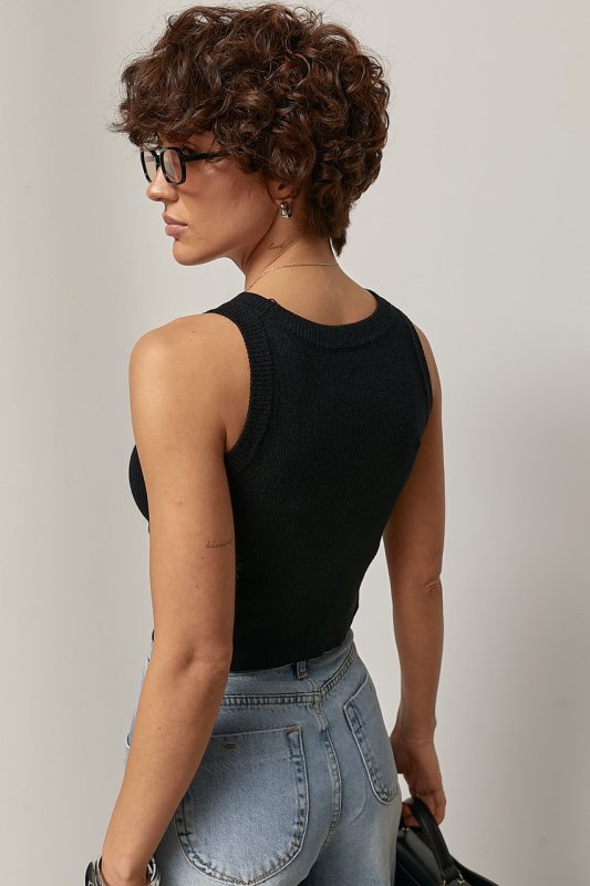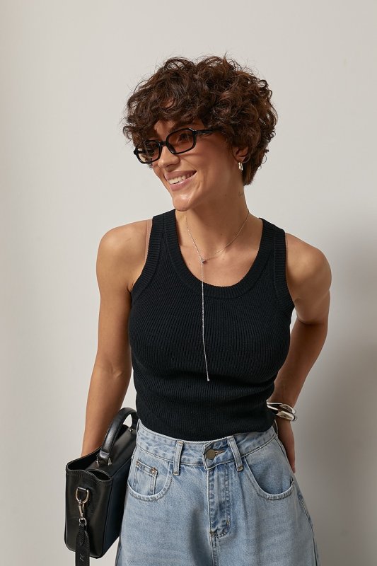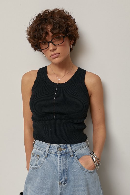 В’язана однотонна майка в рубчик — універсальна база, що поєднує комфорт і стиль. Модель має круглу горловину та закриту спинку, що забезпечує зручну посадку й акуратний вигляд. Фактурна в’язка в рубчик візуально підкреслює силует і надає виробу лаконічної виразності.