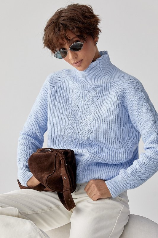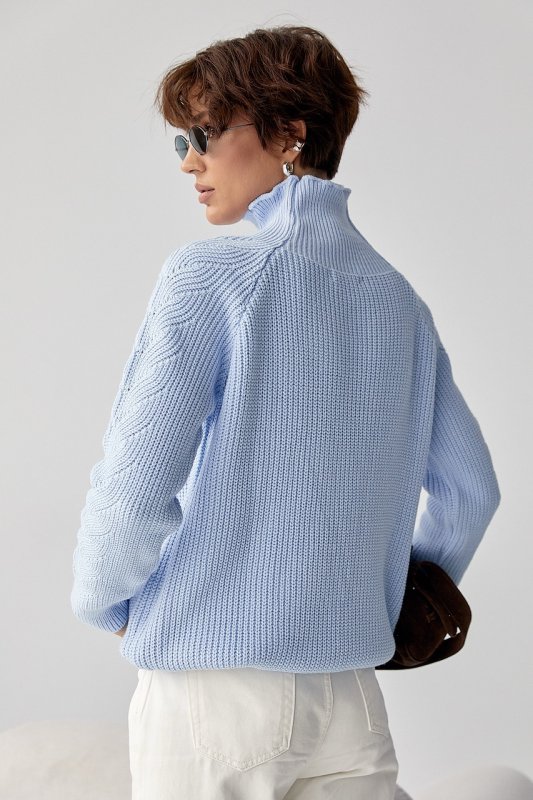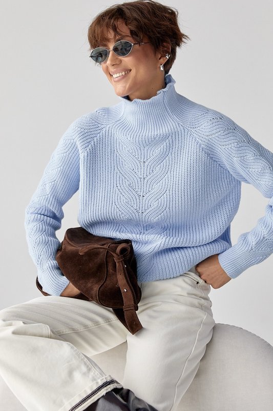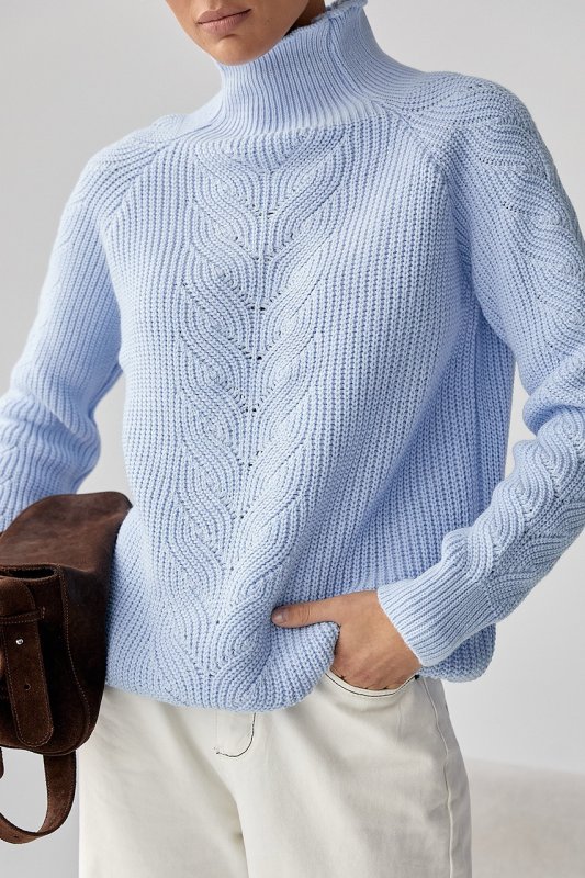 Светр має високу горловину, яка м’яко прилягає до шиї та захищає від прохолоди, створюючи відчуття тепла навіть у найхолодніші дні. Довгі рукави реглан забезпечують зручну посадку й свободу рухів, а манжети на рукавах та по низу виробу допомагають зберігати форму. Подовжений фасон надає силуету витонченості й дозволяє носити светр як окремо, так і в багатошарових комплектах.