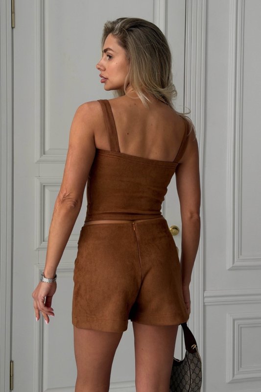 Спідниця-шорти з еко-замші — стильна модель із чіткою посадкою та акуратним силуетом. М’яка фактурна тканина додає образу глибини, а декоративний хлястик із пряжкою підкреслює талію. Завдяки поєднанню спідниці та шортів модель виглядає елегантно, але залишається комфортною в носінні.