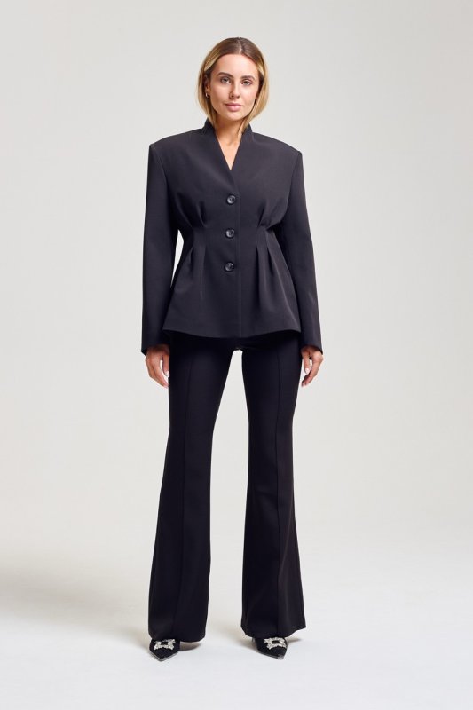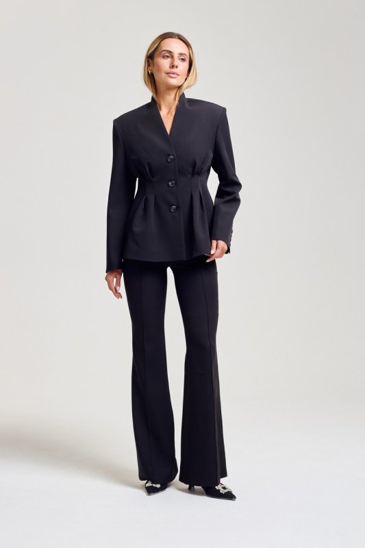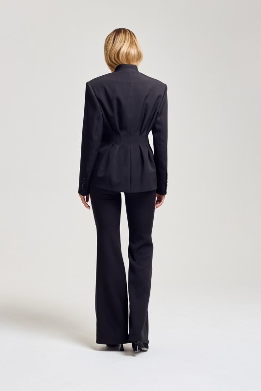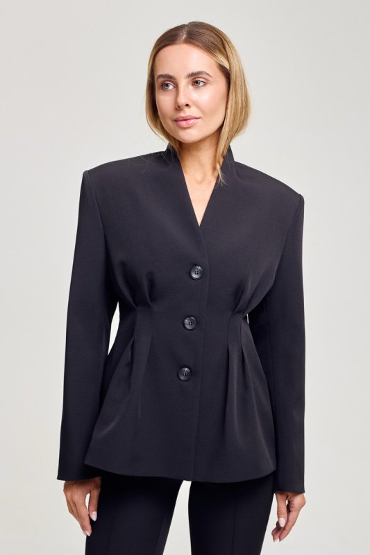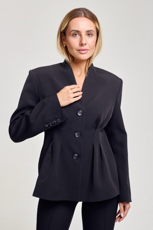 Пиджак приталенного силуэта с защелками по талии спереди и сзади формируют элегантный силуэт. Модель отличается интересным кроем воротника и акцентом на линии талии с мягким разрешением в зоне бедер. Благодаря сочетанию четкого кроя и свободной посадки пиджак выглядит как аккуратный оверсайз. Стильное решение в трендовом исполнении.