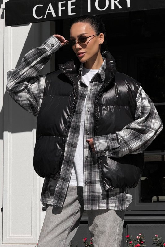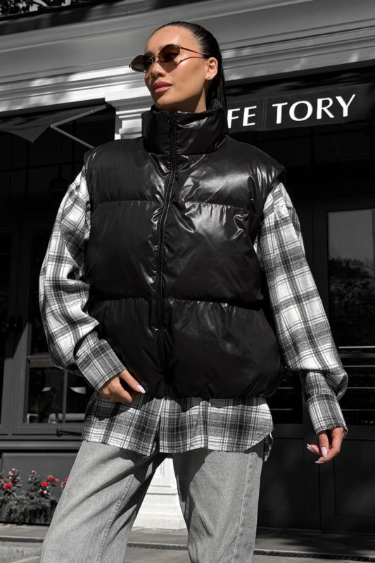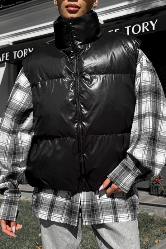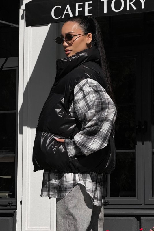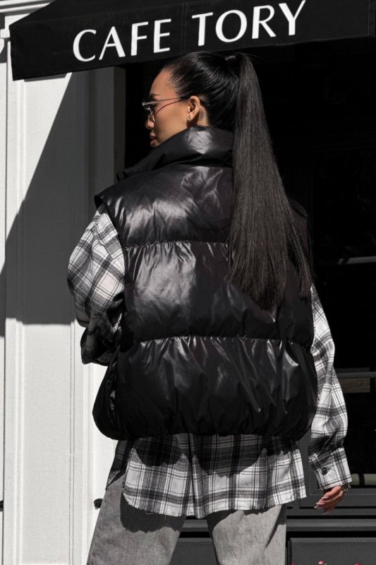 Универсальная модель жилетки на каждый день с воротником-стойкой. Застегивается на молнию, по низу – резика, по бокам – карманы на молнии. Наполнитель – екопух.