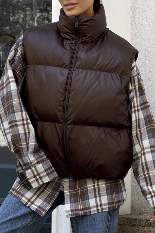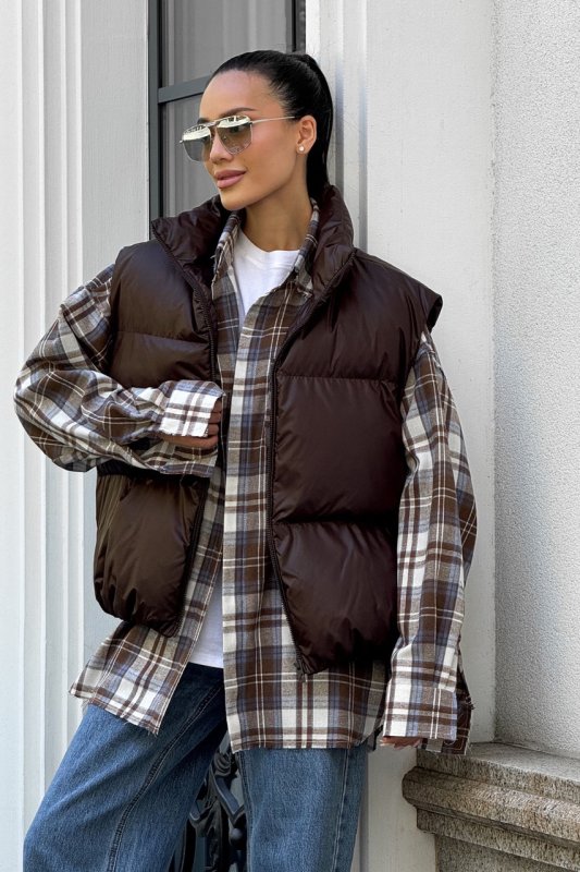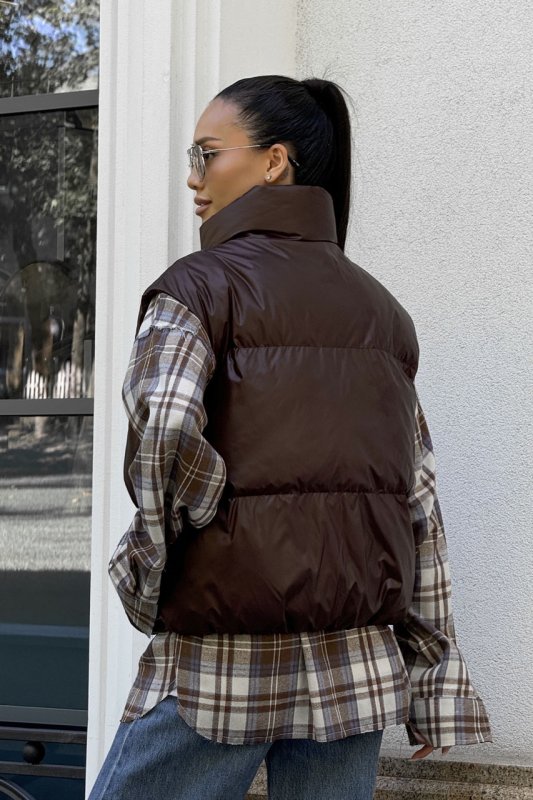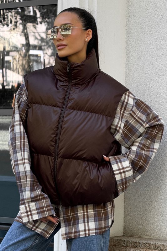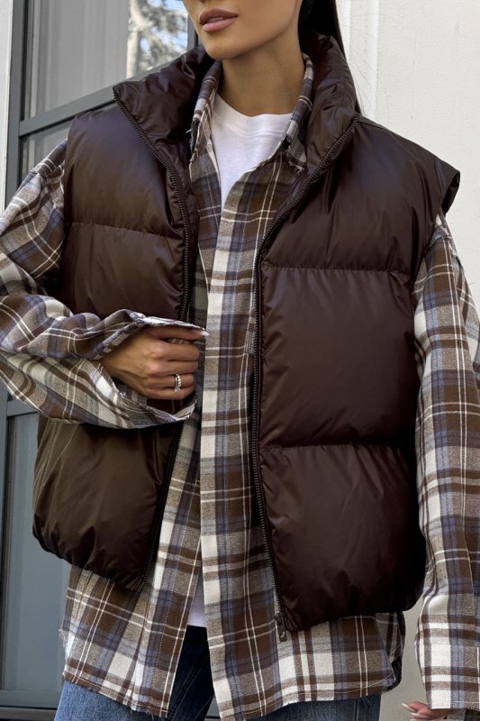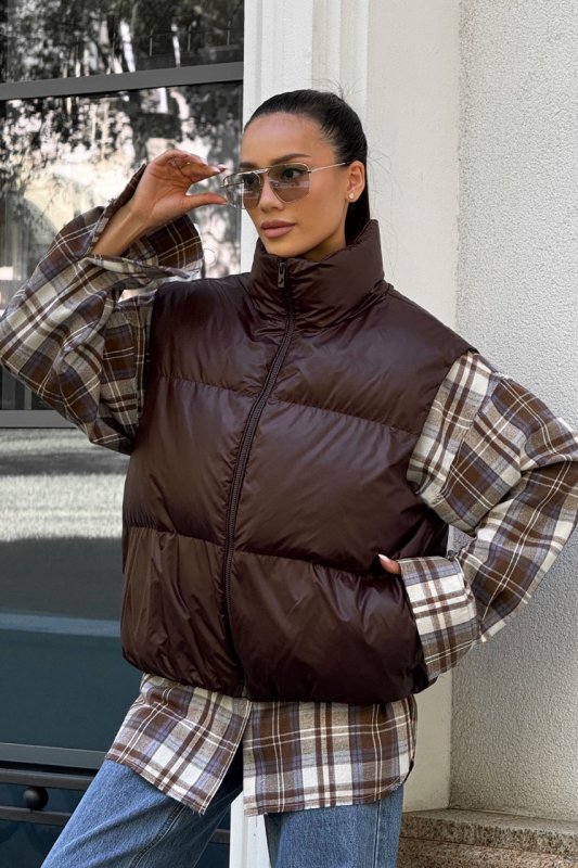 Универсальная модель жилетки на каждый день с воротником-стойкой. Застегивается на молнию, по низу – резика, по бокам – карманы на молнии. Наполнитель – екопух.